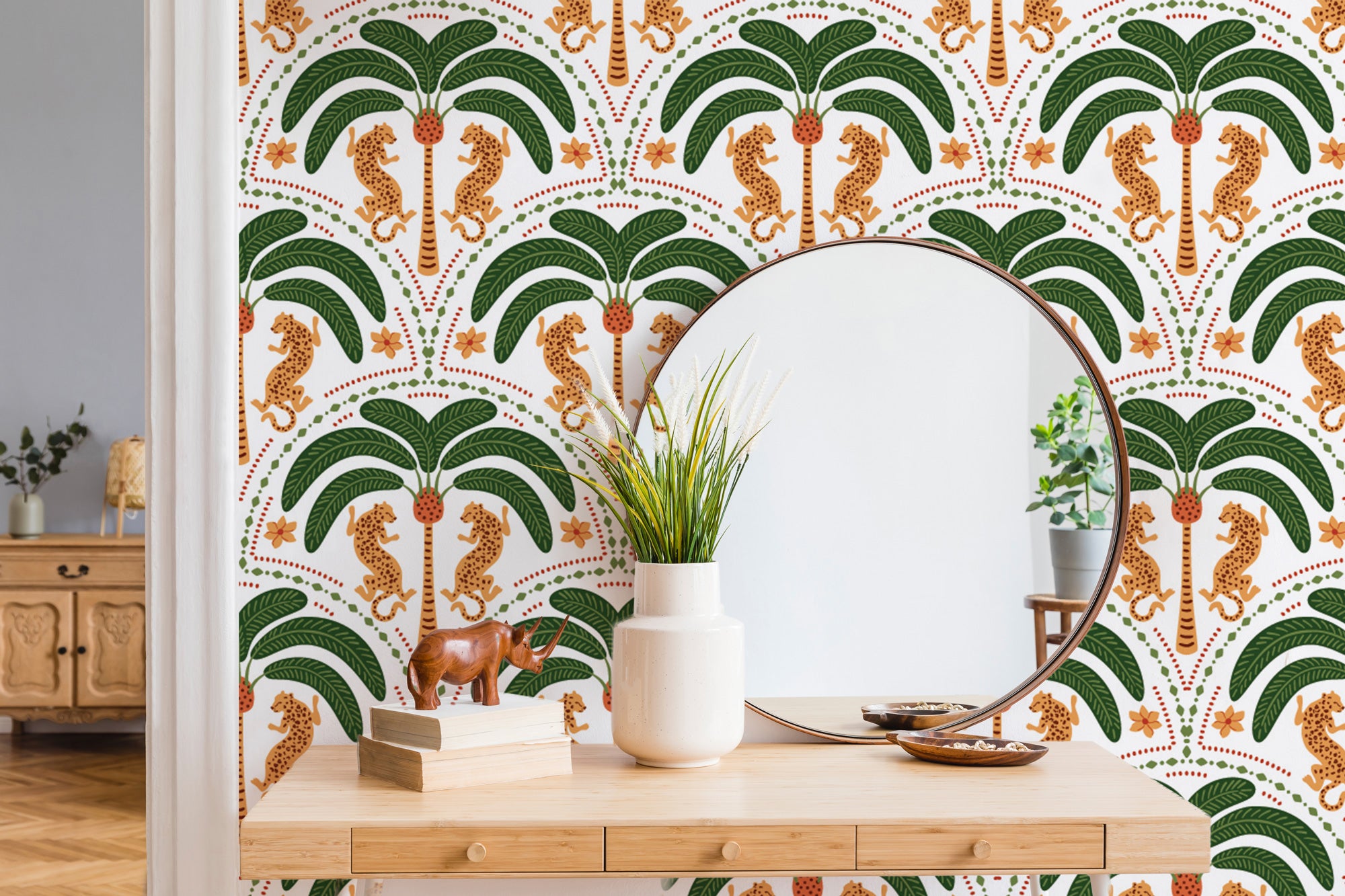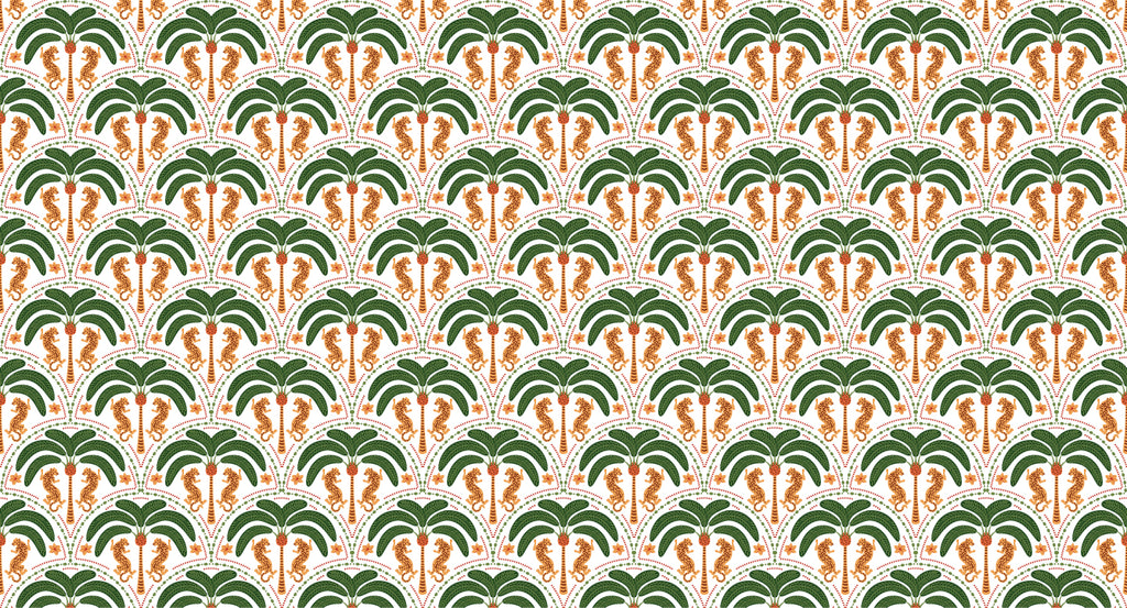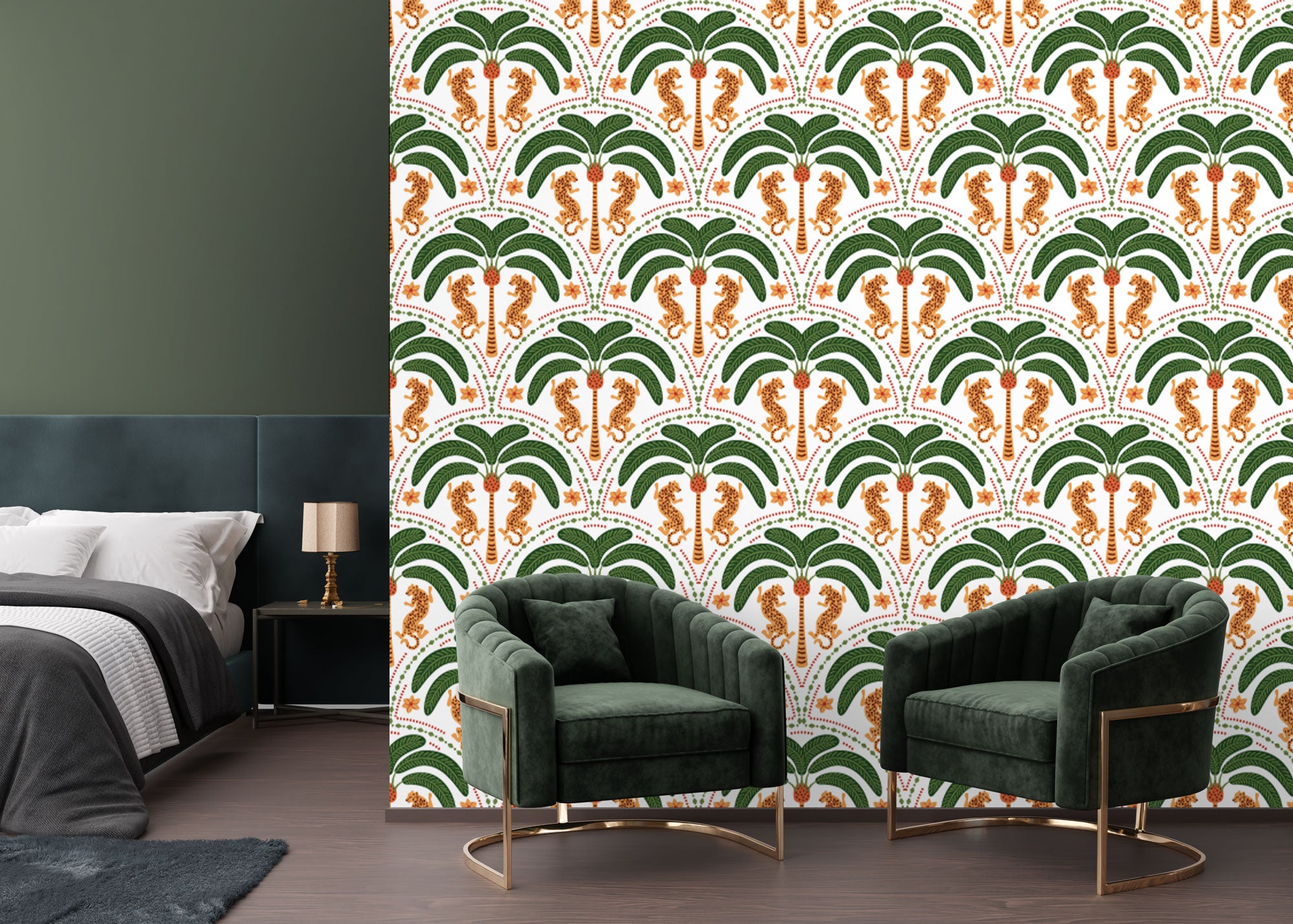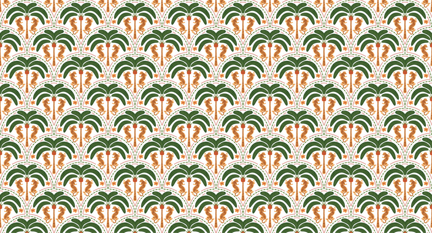 Tropical Luxe Design – A seamless fusion of palm foliage and leopard motifs for an exotic yet refined aesthetic.